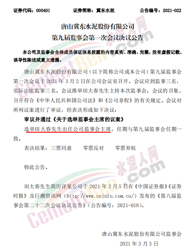 3月2日晚間唐山冀東水泥上市公司連發(fā)五條公告,內容為董事長、總經理、監(jiān)事會主席,以及其他高級管理人員的選舉及任命。