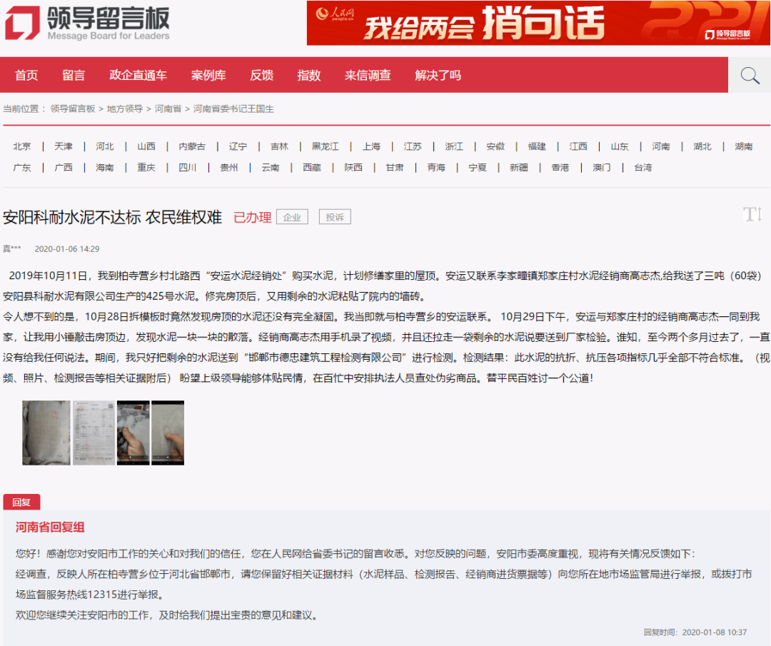 河南省回復(fù):“您好!感謝您對(duì)安陽(yáng)市工作的關(guān)心和對(duì)我們的信任,您在人民網(wǎng)給省委書記的留言收悉。對(duì)您反映的問(wèn)題,安陽(yáng)市委高度重視,現(xiàn)將有關(guān)情況反饋如下:經(jīng)調(diào)查,反映人所在柏寺?tīng)I(yíng)鄉(xiāng)位于河北省邯鄲市,請(qǐng)您保留好相關(guān)證據(jù)材料(水泥樣品、檢測(cè)報(bào)告、經(jīng)銷商進(jìn)貨票據(jù)等)向您所在地市場(chǎng)監(jiān)管局進(jìn)行舉報(bào),或撥打市場(chǎng)監(jiān)督服務(wù)熱線12315進(jìn)行舉報(bào)。歡迎您繼續(xù)關(guān)注安陽(yáng)市的工作,及時(shí)給我們提出寶貴的意見(jiàn)和建議。”