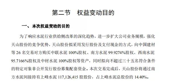同日,浙江尖峰集團(tuán)股份有限公司(以下簡稱“尖峰集團(tuán)”)發(fā)布公告稱,擬參與新疆天山水泥股份有限公司(以下簡稱“天山股份”)的重大資產(chǎn)重組。尖峰集團(tuán)現(xiàn)持有南方水泥有限公司(以下簡稱“南方水泥”)0.95336%股權(quán)(對應(yīng)注冊資本中的出資額為10,500萬元),該股權(quán)經(jīng)評估定價為46,528.909270萬元,天山股份擬以發(fā)行股份購買資產(chǎn)的方式收購該股權(quán)。若交易能順利實(shí)施且天山股份的發(fā)行價格不做調(diào)整,則交易完成后尖峰集團(tuán)將持有天山股份發(fā)行的股份34,774,969股,并不再持有南方水泥的股權(quán)。