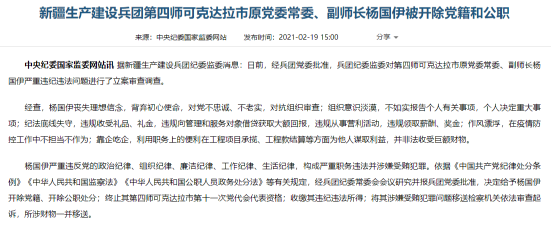 2月19日,中央紀委國家監(jiān)委網(wǎng)站發(fā)布要聞消息《新疆生產(chǎn)建設兵團第四師可克達拉市原黨委常委、副師長楊國伊被開除黨籍和公職》。