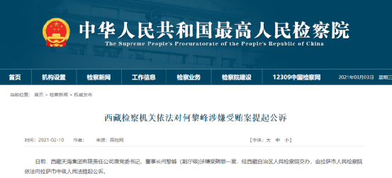 2021年2月10日,最高人民檢察院官網(wǎng)發(fā)布消息:西藏天海集團有限責任公司原黨委書記、董事長何黎峰(副廳級)涉嫌受賄罪一案,經(jīng)西藏自治區(qū)人民檢察院交辦,由拉薩市人民檢察院依法向拉薩市中級人民法提起公訴。