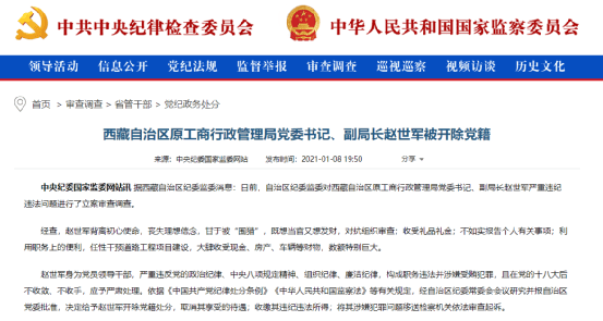 1月8日,中央紀委國家監(jiān)委網(wǎng)站消息《西藏自治區(qū)原工商行政管理局黨委書記、副局長趙世軍被開除黨籍》。