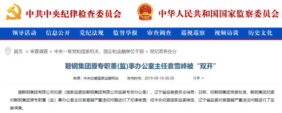 2019年9月16日,中央紀委國家監(jiān)委網(wǎng)站消息,《鞍鋼集團原專職董(監(jiān))事辦公室主任袁雪峰被“雙開”》 。