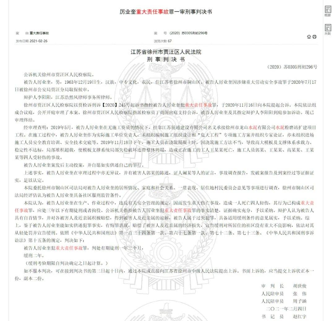 2021年2月26日,中國(guó)裁判文書網(wǎng)發(fā)布了關(guān)于這起事故的一審刑事判決書,掛靠的實(shí)際施工負(fù)責(zé)人被判處有期徒刑一年二個(gè)月。
