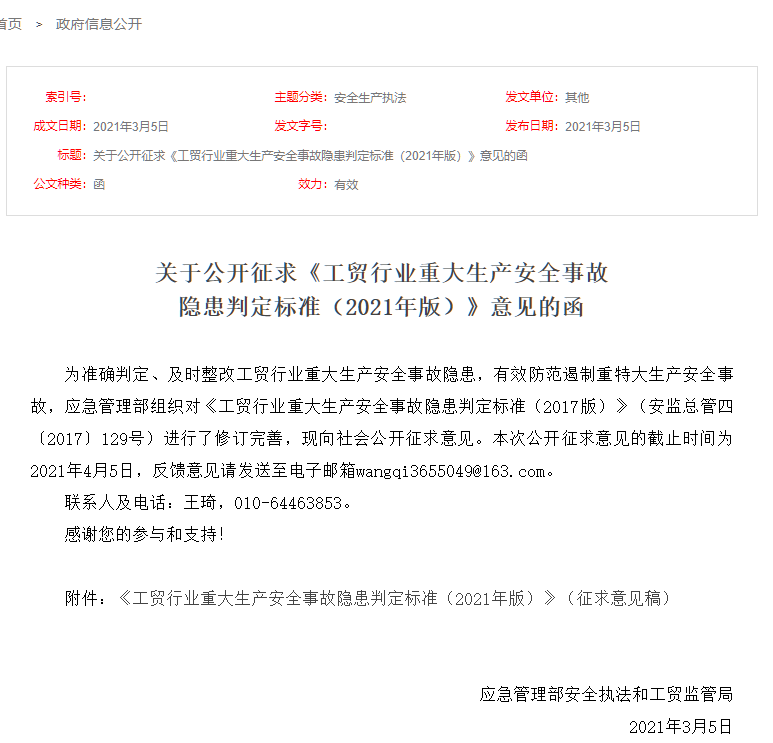 日前,國家應急管理部發布關于公開征求《工貿行業重大生產安全事故隱患判定標準(2021年版)》意見的函稱,為準確判定、及時整改工貿行業重大生產安全事故隱患,有效防范遏制重特大生產安全事故,應急管理部組織對《工貿行業重大生產安全事故隱患判定標準(2017版)》(安監總管四〔2017〕129號)進行了修訂完善,現向社會公開征求意見。