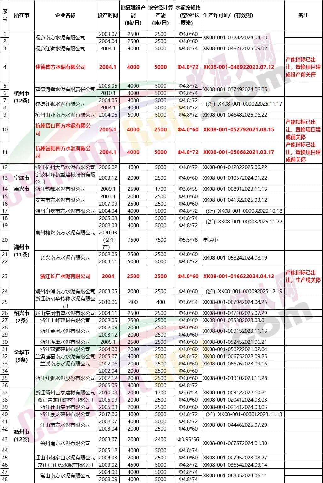 日前,浙江省經濟和信息化廳發布《2020年度浙江省水泥熟料平板玻璃生產清單公示》。公示時間為2021年3月9日起5個工作日。 水泥熟料產能清單顯示,浙江省內共有35家水泥企業,48條水泥熟料生產線,批復建設產能合計4527萬噸/年,按窯徑計算產能合計5211萬噸/年。其中4條生產線450萬噸/年產能指標已明確出讓。 (來源:浙江省經濟和信息化廳)