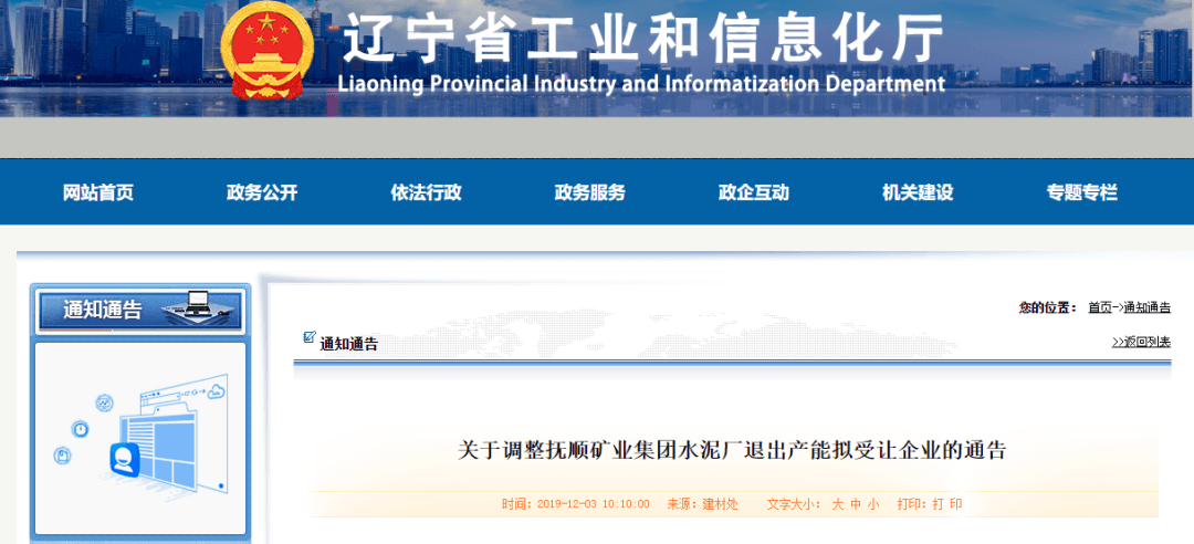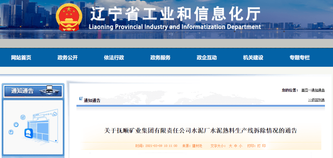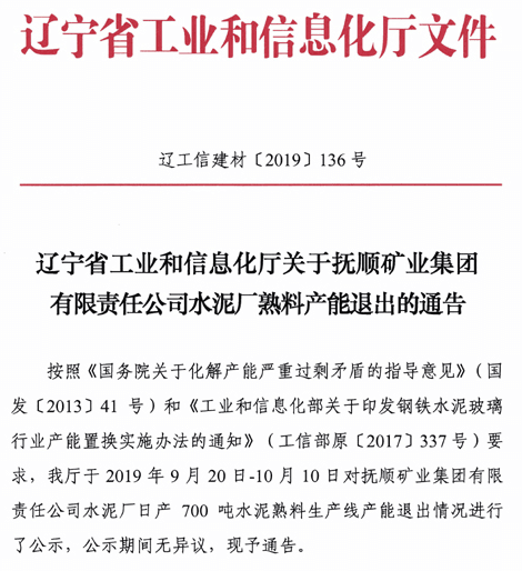 早在2019年10月,遼寧省工信廳就發(fā)布了關(guān)于撫順礦業(yè)集團有限責(zé)任公司水泥廠熟料產(chǎn)能退出的通告。