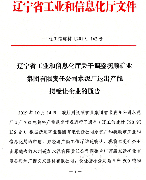 而后,2019年12月,遼寧省工信廳又發(fā)布了關(guān)于調(diào)整撫順礦業(yè)集團水泥廠退出產(chǎn)能擬受讓企業(yè)的通告,稱將擬受讓企業(yè)由原通告的永州蓮花水泥有限責(zé)任公司調(diào)整為廣西新東運礦業(yè)有限公司和廣西義來建材有限公司,受讓指標(biāo)分別為日產(chǎn)500噸和200噸。
