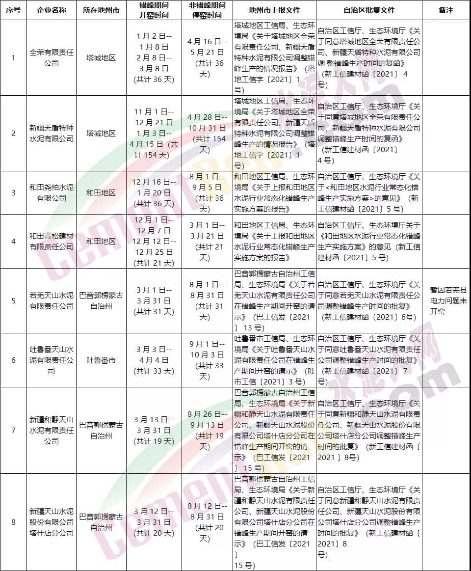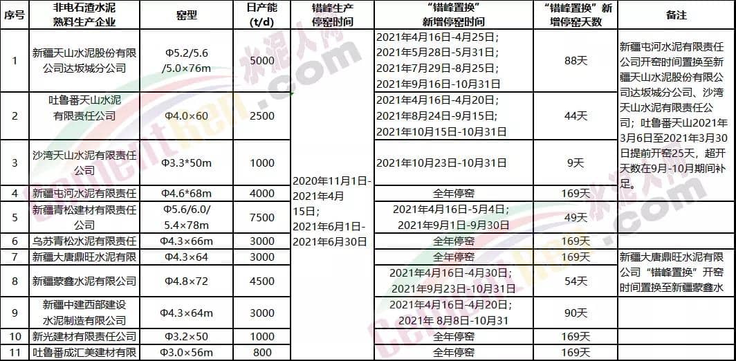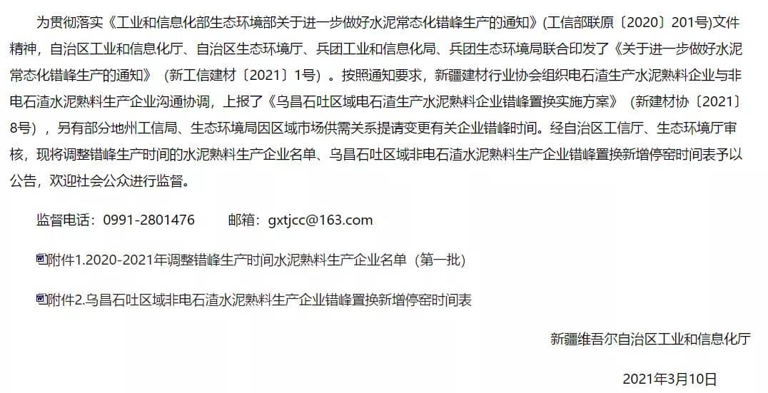 日前,新疆維吾爾自治區(qū)工業(yè)和信息化廳發(fā)布《關(guān)于對2020-2021年新疆水泥企業(yè)調(diào)整錯峰生產(chǎn)時間及電石渣水泥企業(yè)錯峰置換情況的公告》。