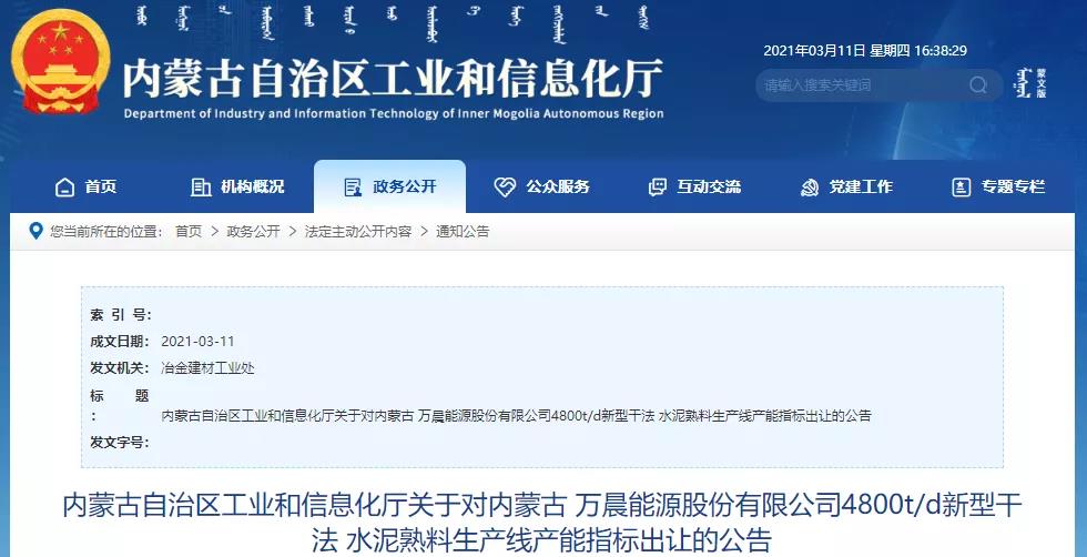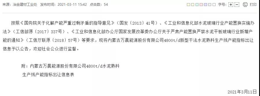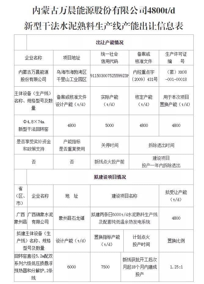 內(nèi)蒙古萬晨能源股份有限公司4800t/d熟料生產(chǎn)線產(chǎn)能指標(biāo)出讓