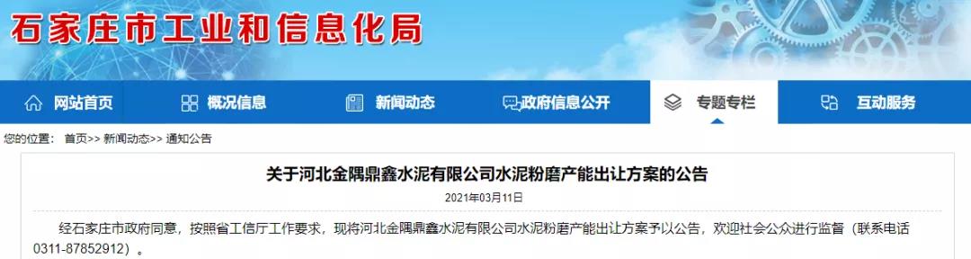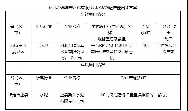 同期,河北省石家莊市工業(yè)和信息化局發(fā)布《關(guān)于河北金隅鼎鑫水泥有限公司粉磨產(chǎn)能出讓方案的公告》,出讓方案顯示河北金隅鼎鑫水泥有限公司將退出100萬噸/年粉磨產(chǎn)能,用于唐縣冀東水泥有限責(zé)任公司建設(shè)新線。