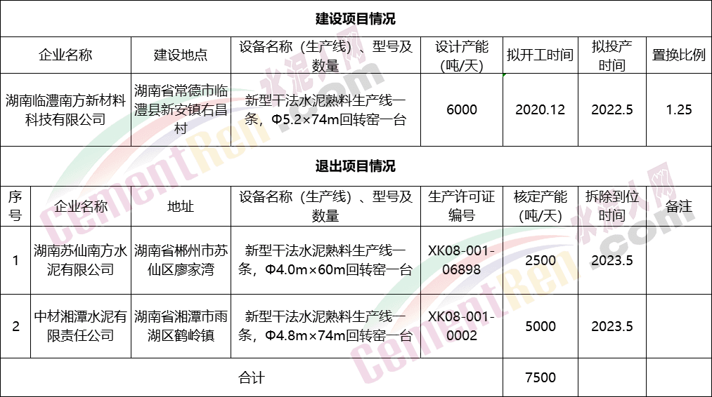 淘汰的產(chǎn)能來自郴州市的湖南蘇仙南方水泥有限公司,2500t/d生產(chǎn)線一條;中材湘潭水泥有限責(zé)任公司,5000t/d生產(chǎn)線一條,拆除時(shí)間都是2023年5月。