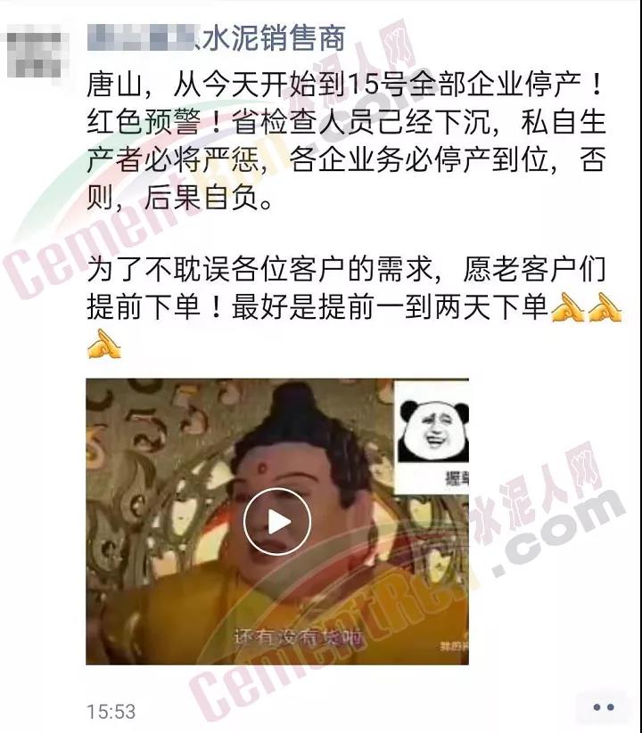 水泥人網(wǎng)通訊員消息:日前有水泥經(jīng)銷(xiāo)商通知,“從12日起到15日河北唐山地區(qū)全部企業(yè)停產(chǎn)!紅色預(yù)警!省檢查人員已經(jīng)下沉,私自生產(chǎn)者必將嚴(yán)懲,各企業(yè)務(wù)必停產(chǎn)到位,否則,后果自負(fù)。為了不耽誤各位客戶(hù)的需求,請(qǐng)老客戶(hù)提前一到兩天下單。”