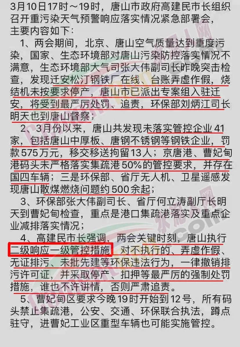 據(jù)水泥人網(wǎng)了解,經(jīng)銷(xiāo)商提到的“紅色預(yù)警”是指,3月10日17時(shí)~19時(shí),唐山市政府高建民市長(zhǎng)組織召開(kāi)重污染天氣預(yù)警響應(yīng)落實(shí)情況緊急部署會(huì)時(shí)提到的“唐山執(zhí)行二級(jí)響應(yīng)一級(jí)管控措施”要求。