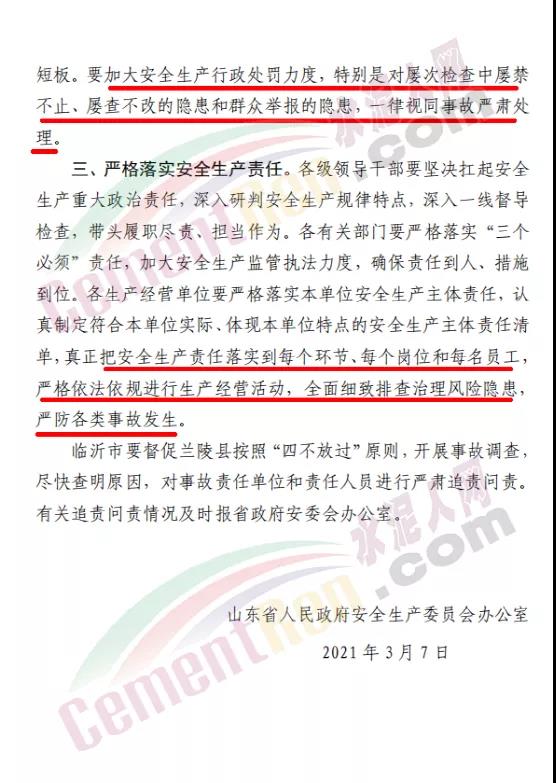 據水泥人網了解,應上述文件要求山東省臨沂市蘭陵縣安委會已于3月12日開始,通過單位聯合、聘請專家等方式,按照行業監管、部門主管、鄉鎮(街道)所屬的原則,暗訪抽查所有企業、所有工地、九小場所、工商貿企業、加油站點、涉氨制冷等方面的企業安全生產隱患排查、員工培訓、應知應會、應急預案、應急演練等工作。