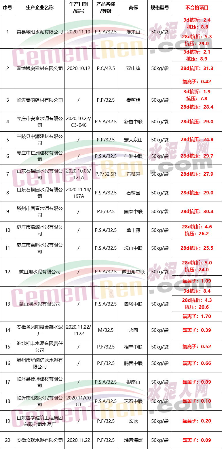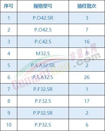 經檢測,共檢出不合格水泥20批次,不合格率高達23.5%。其中抗壓、抗折強度不合格13個批次,氯離子含量超標不合格10個批次,不合格項目及批次為: