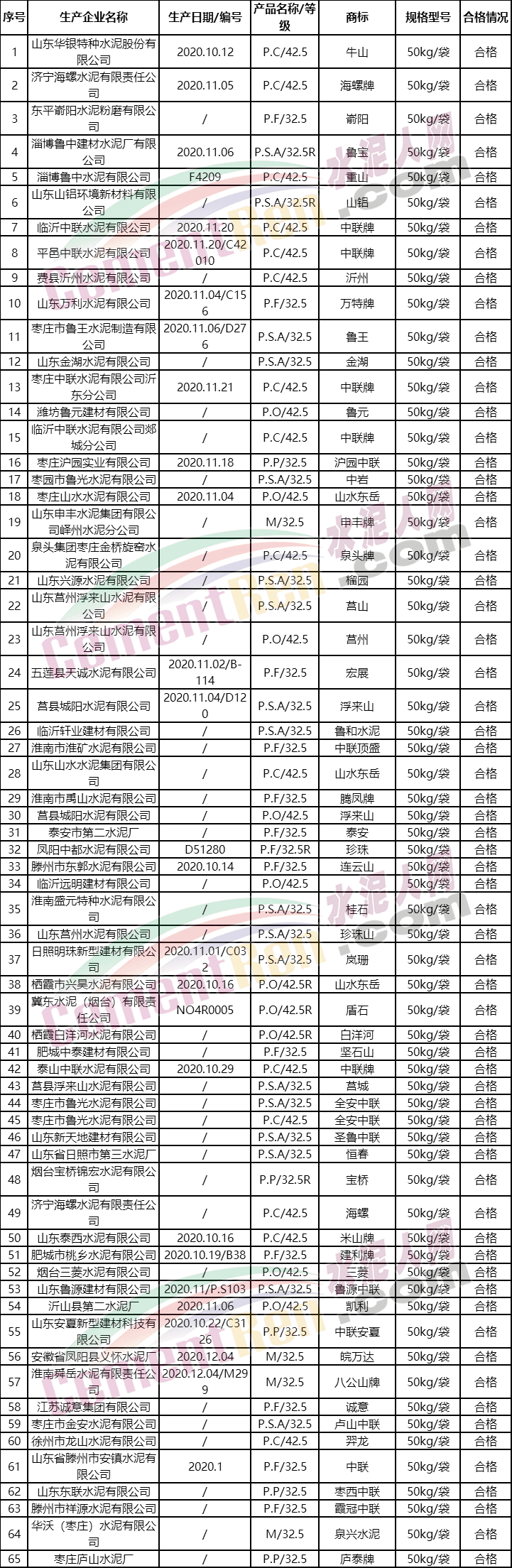 抽檢合格水泥產品名單