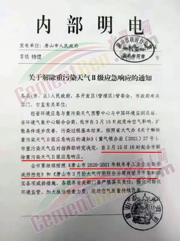 唐山市人民政府發(fā)布特提內(nèi)部明電《關(guān)于解除重污染天氣II級(jí)應(yīng)急響應(yīng)的通知》要求自3 月15日16 時(shí)起全市解除重污染天氣ⅡI級(jí)應(yīng)急響應(yīng)。唐山全市要繼續(xù)按照《唐山市 2020-2021年秋冬季工業(yè)企業(yè)日常減排措施》和《唐山市3 月份大氣污染綜合治理攻堅(jiān)月方案》落實(shí)各項(xiàng)減排措施。各級(jí)各有關(guān)部門要嚴(yán)格落實(shí)責(zé)任,強(qiáng)化網(wǎng)格化環(huán)境監(jiān)管,加大執(zhí)法檢查力度,促進(jìn)空氣質(zhì)量持續(xù)改善。