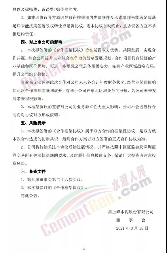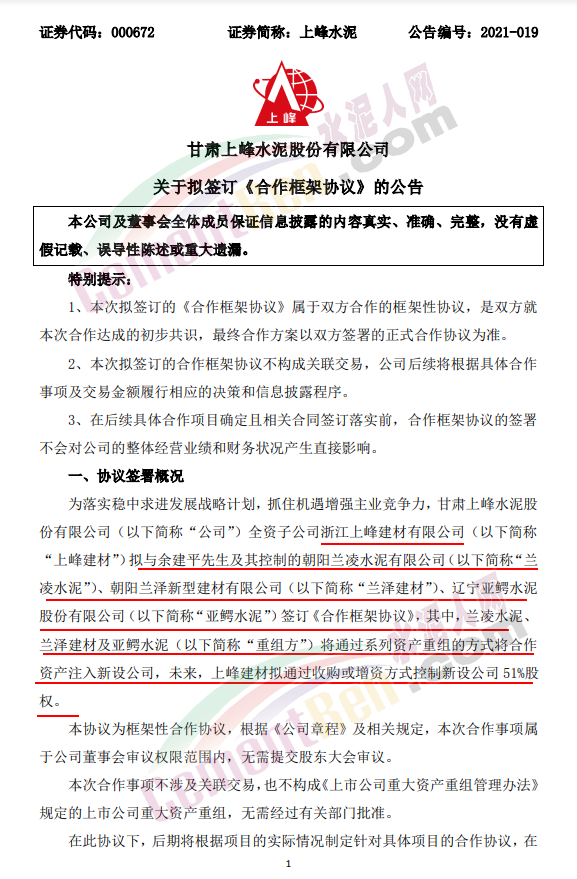 日前,上峰水泥發布《關于擬簽訂<合作框架協議>的公告》稱,公司全資子公司上峰建材擬與余建平及其控制的蘭凌水泥、蘭澤建材、亞鱷水泥簽訂《合作框架協議》,其中,蘭凌水泥、蘭澤建材及亞鱷水泥將通過系列資產重組的方式將合作資產注入新設公司,未來,上峰建材擬通過收購或增資方式控制新設公司51%股權。