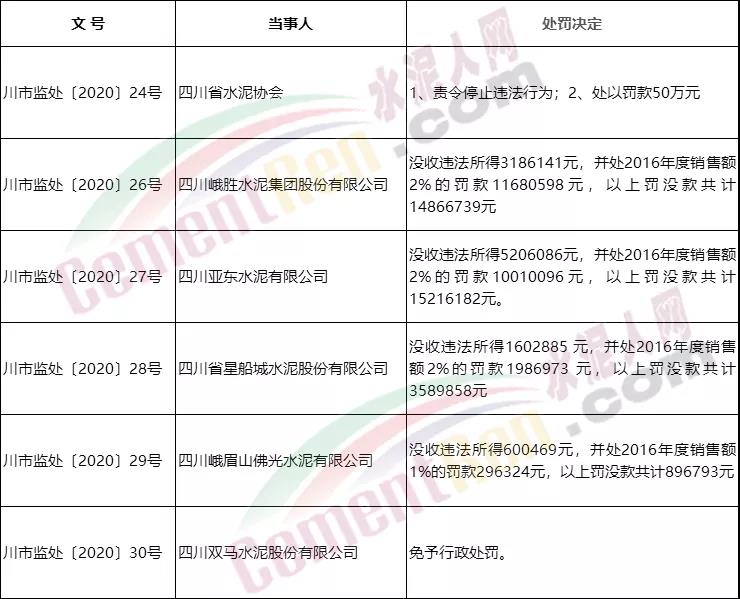 3月16日,四川省市場監(jiān)督管理局發(fā)布6條《行政處罰決定書》。其中針對于當(dāng)?shù)?a href="http://www.haier-rtzl.com/news/list_1.html" target="_blank" class="keylink">水泥行業(yè)的處罰決定書提到案件來源及調(diào)查經(jīng)過為:2017年7月,四川省發(fā)展和改革委員會(huì)從多個(gè)途徑收到反映四川省水泥協(xié)會(huì)組織本行業(yè)經(jīng)營者聯(lián)合漲價(jià)的舉報(bào)。經(jīng)初步核查后,四川省發(fā)展和改革委員會(huì)于2017年7月20日正式對四川省水泥協(xié)會(huì)及涉嫌達(dá)成并實(shí)施壟斷協(xié)議 的六家水泥經(jīng)營者予以立案調(diào)查。