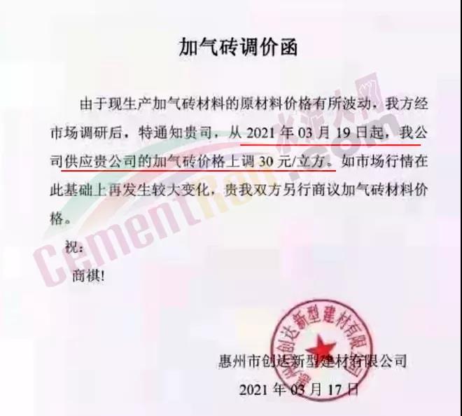 惠州市創達新型建材有限公司通知,由于現生產加氣磚材料的原材料價格有所波動,從2021年 03月19日起,公司供應貴公司的加氣磚價格上調 30元/立方。