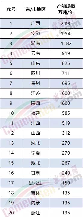 從上述新建項目分區(qū)域來看,廣西壯族自治區(qū)、安徽省、湖南省三個區(qū)域產(chǎn)能達(dá)到千萬噸以上,其中廣西地區(qū)新增產(chǎn)能規(guī)模達(dá)到2490萬噸/年,包括 11個項目13條新建生產(chǎn)線。