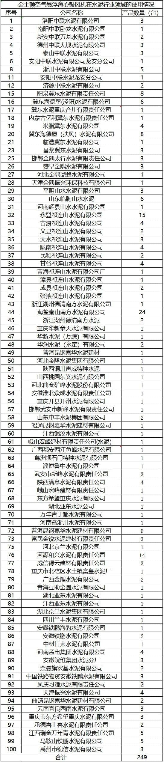 自金隅太行成功的使用了兩臺空氣懸浮風機后,更多的水泥企業(yè)開始嘗試使用金士頓空氣懸浮風機。據(jù)水泥人網(wǎng)不完全統(tǒng)計,截止目前水泥行業(yè)領域共有249臺金士頓空氣懸浮風機投入使用,金隅冀東,祁連山水泥,山水水泥,南方水泥,中聯(lián)水泥,東方希望水泥,華新水泥,昆鋼嘉華,曲寨水泥,京蘭水泥、亞東水泥等均有上線金士頓空氣懸浮風機。