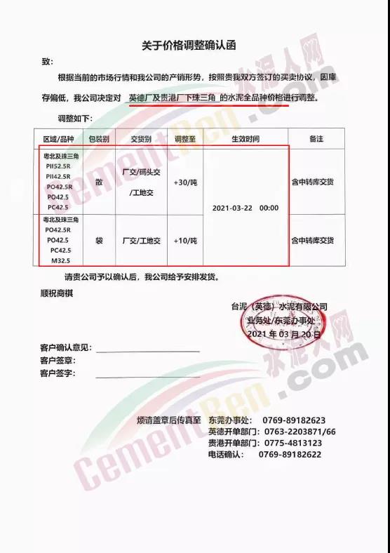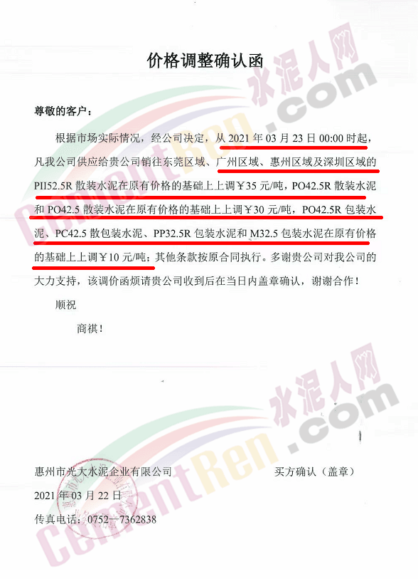 惠州市光大水泥通知,根據(jù)市場(chǎng)實(shí)際情況,經(jīng)公司決定,從2021年03月23日零時(shí)起,公司銷往東莞區(qū)域、廣州區(qū)域、惠州區(qū)域及深圳區(qū)域的 PII52.5R散裝水泥在原有價(jià)格的基礎(chǔ)上上調(diào)35元/噸,PO42.5R散裝水泥和PO42.5散裝水泥在原有價(jià)格的基礎(chǔ)上上調(diào)30元/噸,PO42.5R包裝水泥、PC42.5 散包裝水泥、PP32.5R包裝水泥和M32.5包裝水泥在原有價(jià)格的基礎(chǔ)上上調(diào)10元/噸;其他條款按原合同執(zhí)行。