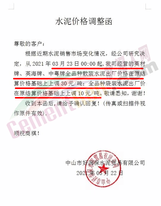 中山市好潤(rùn)保水泥貿(mào)易有限公司通知,從2021年03月23日零時(shí)起,公司經(jīng)營(yíng)的英材牌、英海牌、中粵牌全品種散裝水泥出廠價(jià)格在原結(jié)算價(jià)格基礎(chǔ)上上調(diào) 30元/噸;全品種袋裝水泥出廠價(jià)在原結(jié)算價(jià)格基礎(chǔ)上上調(diào) 10元/噸。
