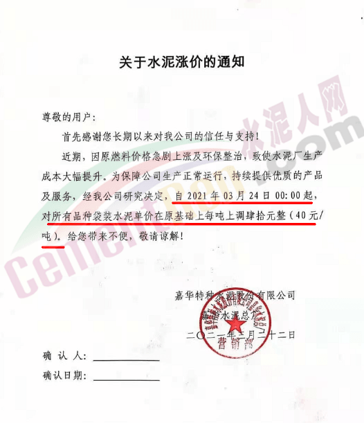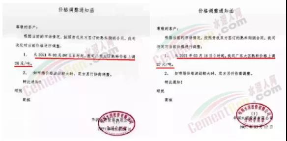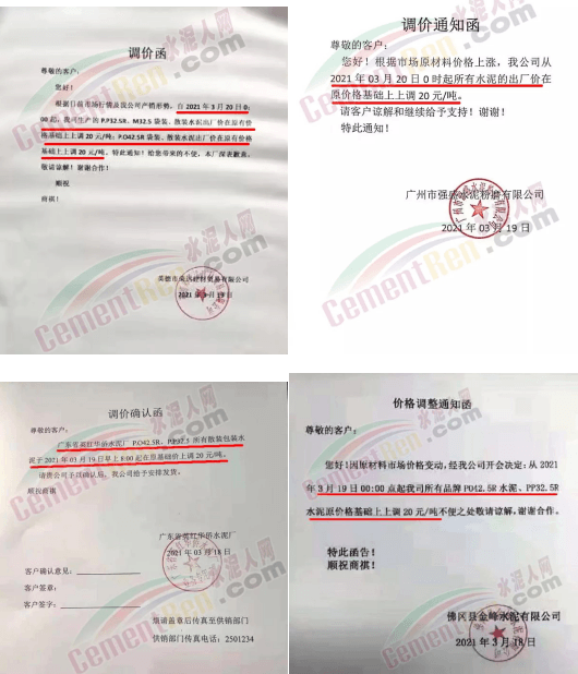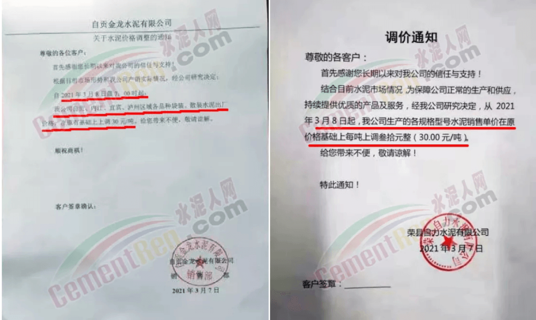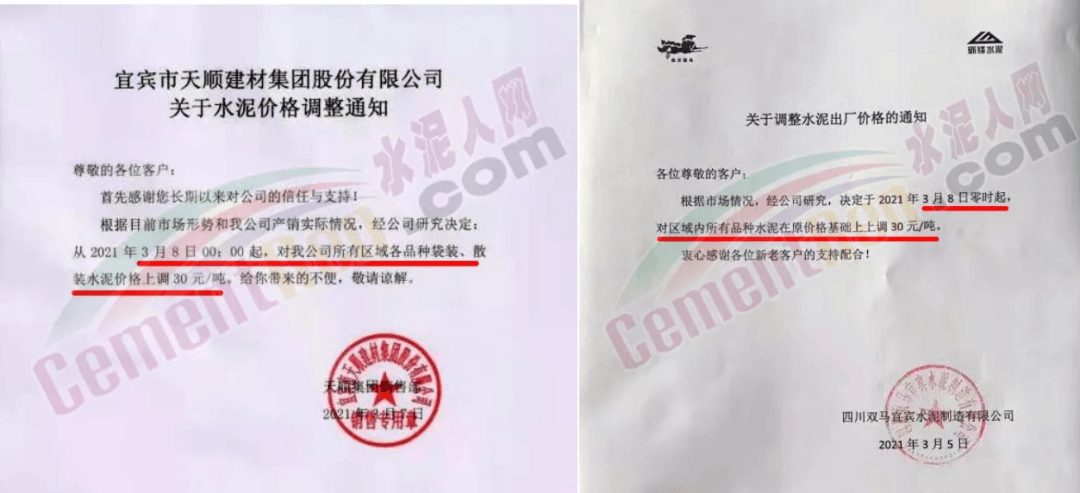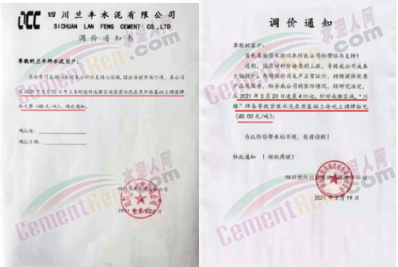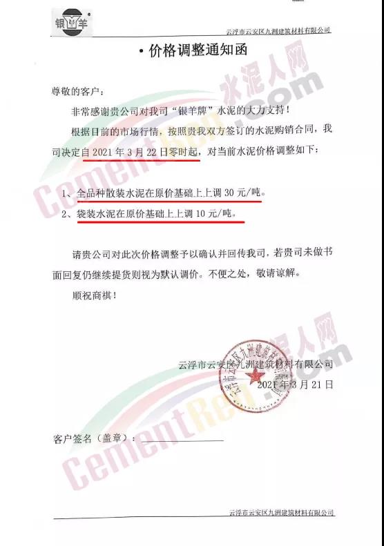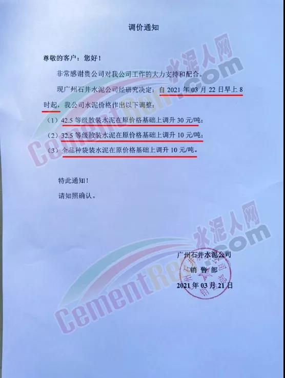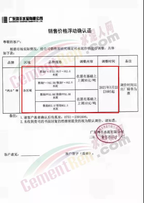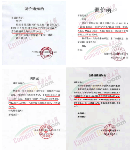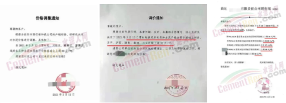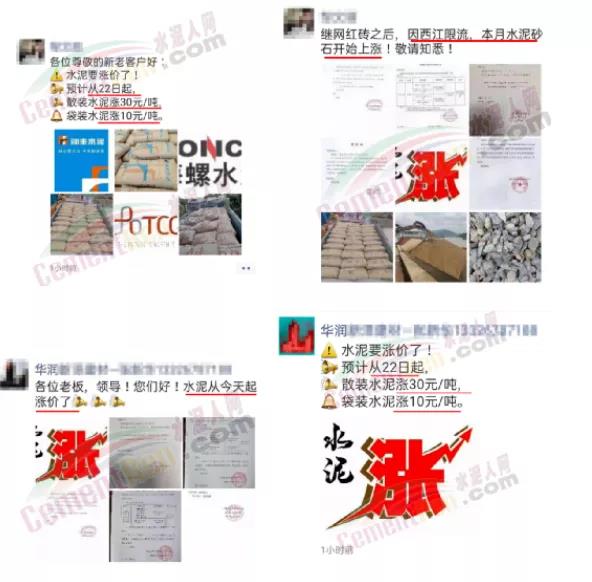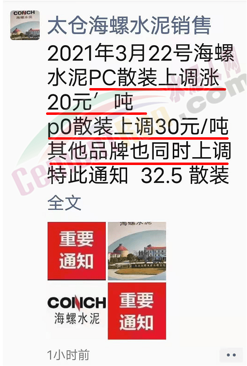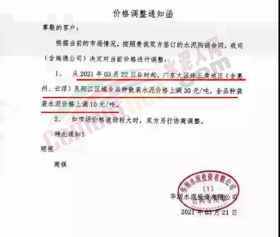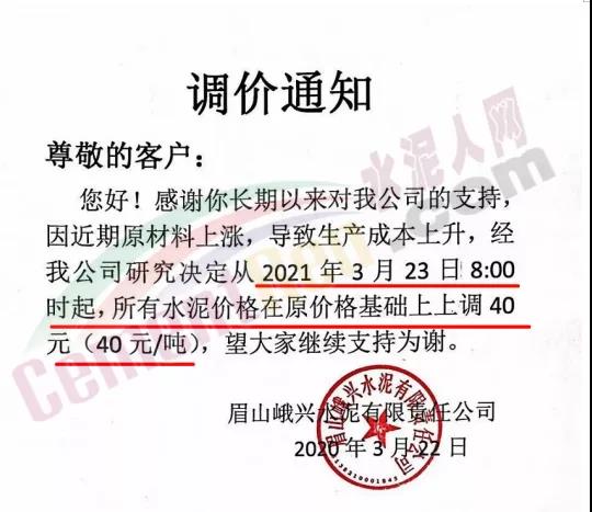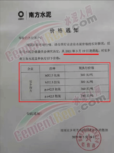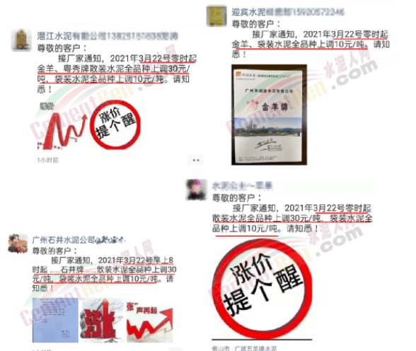 同時(shí),下游經(jīng)銷商也集體發(fā)通知告知客戶水泥漲價(jià)的消息。