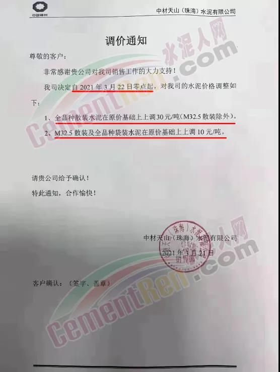中材天山(珠海)、中材亨達(dá)水泥通知自3月22日起全品種散裝上調(diào)30元/噸(不含M32.5散裝),M32.5全品種散裝包裝上調(diào)10元/噸。