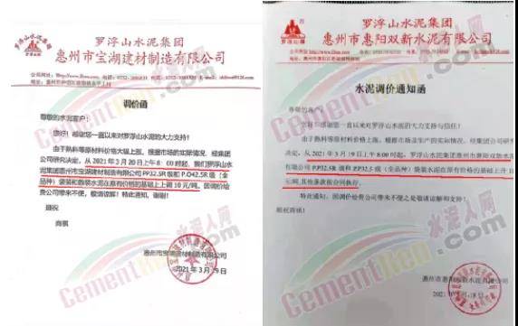 羅浮山水泥集團(tuán)惠州市寶湖建材水泥通知3月20日起PO42.5級(jí)水泥上調(diào)10元/噸。惠陽(yáng)雙新水泥通知3月19日起上調(diào)P.P32.5R級(jí)和P.P32.5級(jí)全品種袋裝水泥10元/噸。