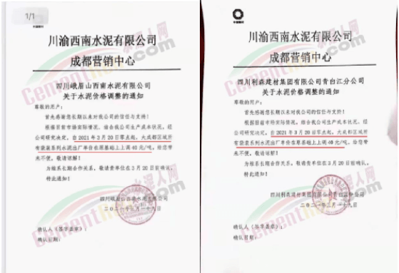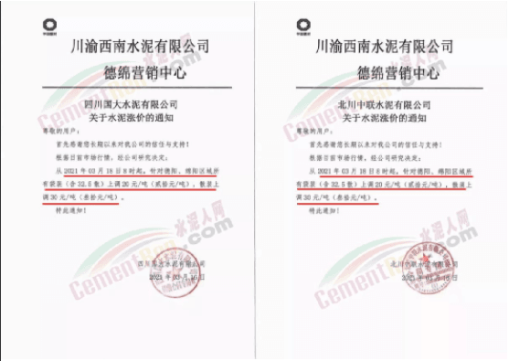 其中,渝西南水泥成都營(yíng)銷中心下屬四川省女?huà)z建材有限公司、四川利森建材集團(tuán)青白江分公司、四川峨眉山西南水泥通知自3月20日零點(diǎn)起,大成都區(qū)域所有袋裝系列水泥出廠單價(jià)在原基礎(chǔ)上上調(diào)40元/噸;