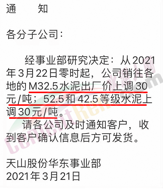 天山股份華東事業(yè)部通知22日零時(shí)起公司銷彷一各地的M32.5水泥出廠價(jià)上調(diào)30元/噸,52.5和42.5等級(jí)水泥上調(diào)30元/噸。