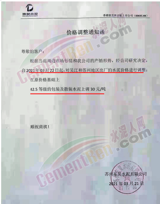 蘇州東吳水泥通知,3月22日起對(duì)吳江和蘇州地區(qū)出廠的水泥價(jià)格進(jìn)行調(diào)整,42.5等級(jí)包裝及散裝水泥統(tǒng)一上調(diào)30元/噸。