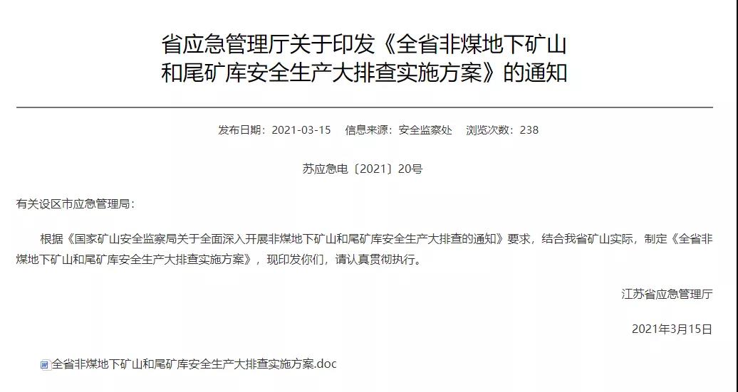 近日,記者從江蘇省應(yīng)急管理廳了解到,為杜絕礦山較大以上事故,有效防范和遏制一般事故,江蘇省應(yīng)急管理廳印發(fā)通知,啟動(dòng)對(duì)全省非煤地下礦山和尾礦庫的安全生產(chǎn)大排查。