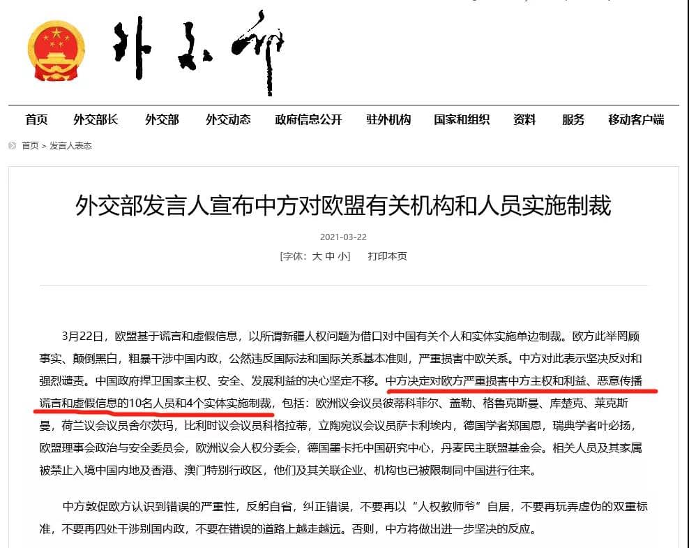 中方?jīng)Q定對(duì)歐方嚴(yán)重?fù)p害中方主權(quán)和利益、惡意傳播謊言和虛假信息的10名人員和4個(gè)實(shí)體實(shí)施制裁,包括:歐洲議會(huì)議員彼蒂科菲爾、蓋勒、格魯克斯曼、庫(kù)楚克、萊克斯曼,荷蘭議會(huì)議員舍爾茨瑪,比利時(shí)議會(huì)議員科格拉蒂,立陶宛議會(huì)議員薩卡利埃內(nèi),德國(guó)學(xué)者鄭國(guó)恩,瑞典學(xué)者葉必?fù)P,歐盟理事會(huì)政治與安全委員會(huì),歐洲議會(huì)人權(quán)分委會(huì),德國(guó)墨卡托中國(guó)研究中心,丹麥民主聯(lián)盟基金會(huì)。相關(guān)人員及其家屬被禁止入境中國(guó)內(nèi)地及香港、澳門特別行政區(qū),他們及其關(guān)聯(lián)企業(yè)、機(jī)構(gòu)也已被限制同中國(guó)進(jìn)行往來(lái)。