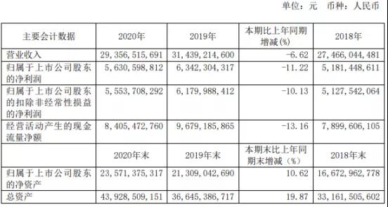 公告披露顯示經(jīng)董事會(huì)審議的報(bào)告期利潤(rùn)分配預(yù)案或公積金轉(zhuǎn)增股本預(yù)案:2020年度,母公司實(shí)現(xiàn)凈利潤(rùn)為3,155,313,737元,合并后歸屬于母公司股東的凈利潤(rùn)為5,630,598,812元。截止2020年12月31日母公司可供分配利潤(rùn)為7,370,600,800元。
