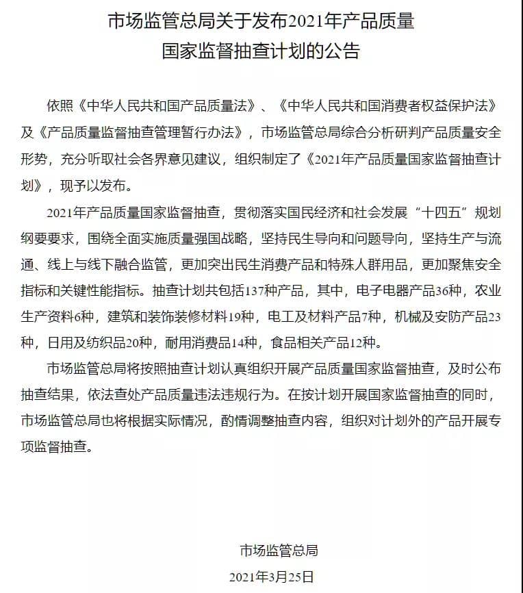 2021年產(chǎn)品質(zhì)量國家監(jiān)督抽查計劃