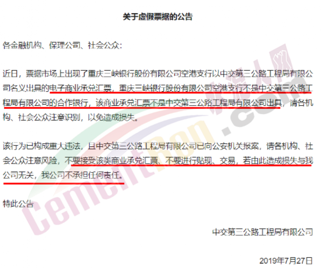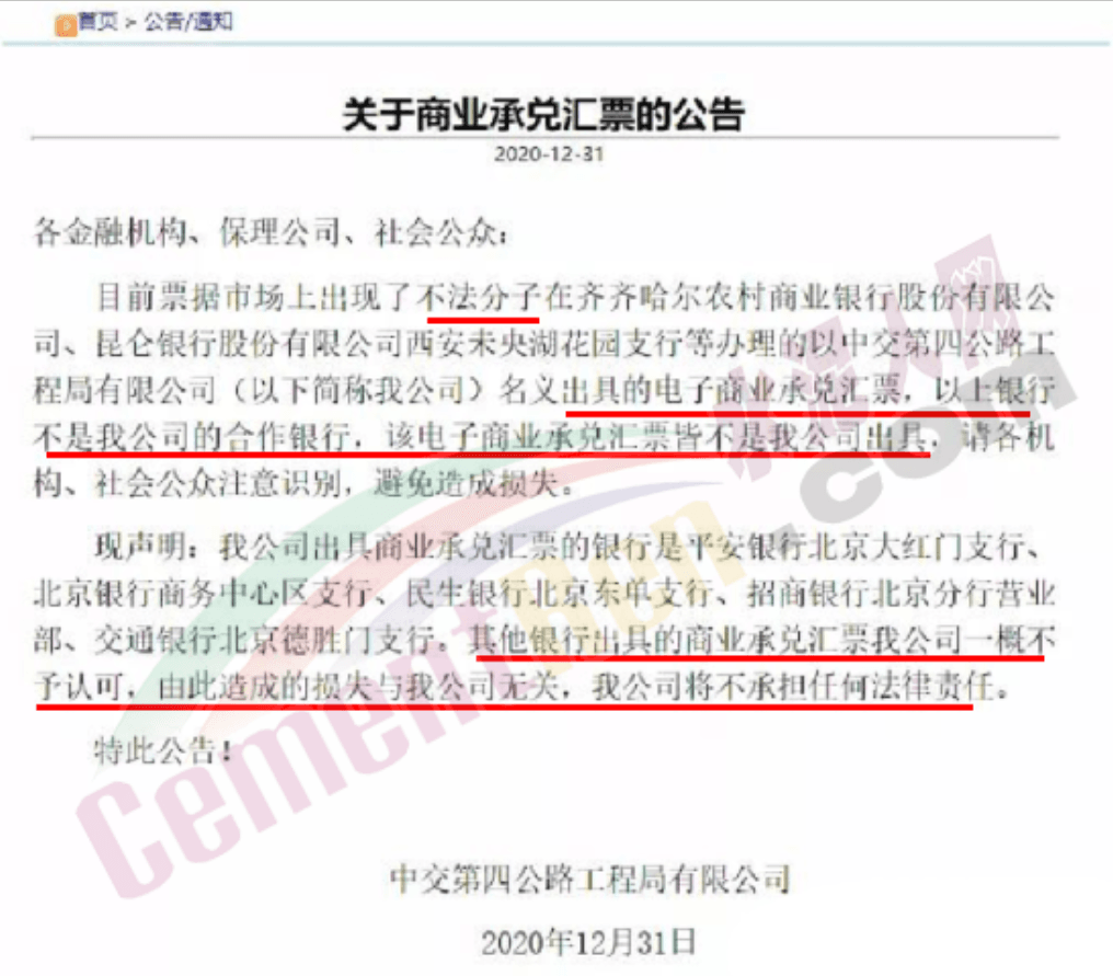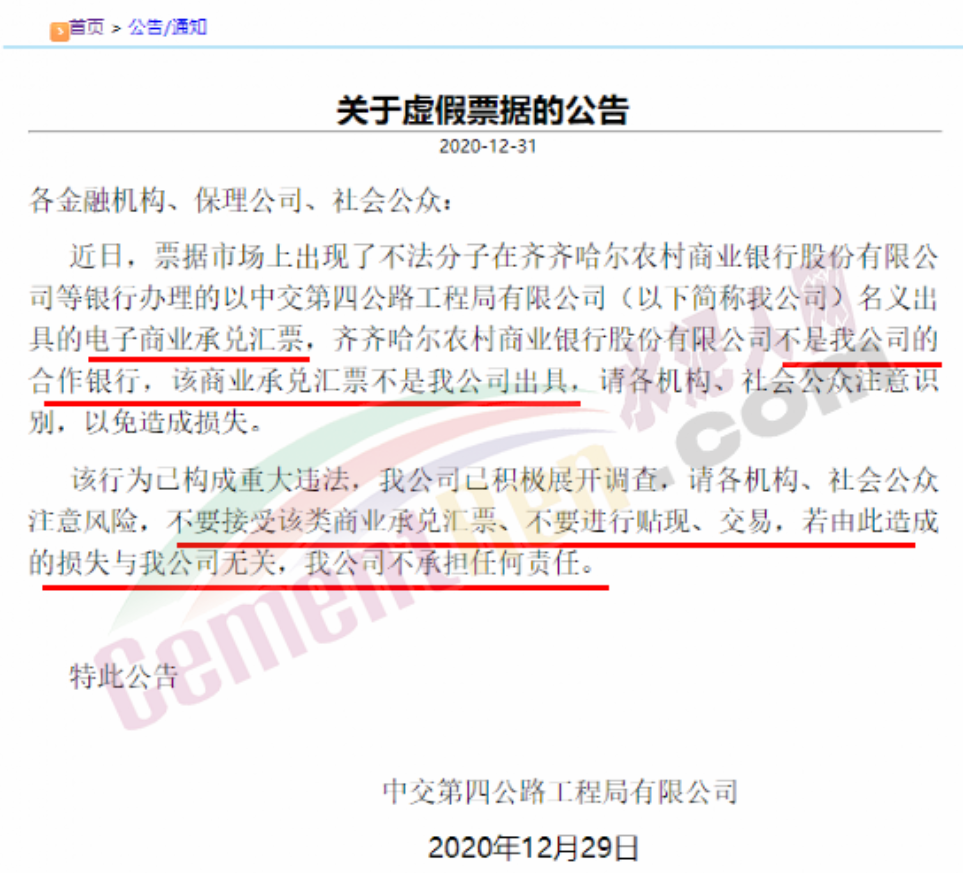 中交第四公路工程局有限公司的另一則公告提到,票據市場上出現了不法分子在齊齊哈爾農村商業銀行股份有限公司等銀行辦理的以中交第四公路工程局有限公司名義出具的電子商業承兌匯票,齊齊哈爾農村商業銀行股份有限公司不是公司的合作銀行,該商業承兌匯票不是公司出具。