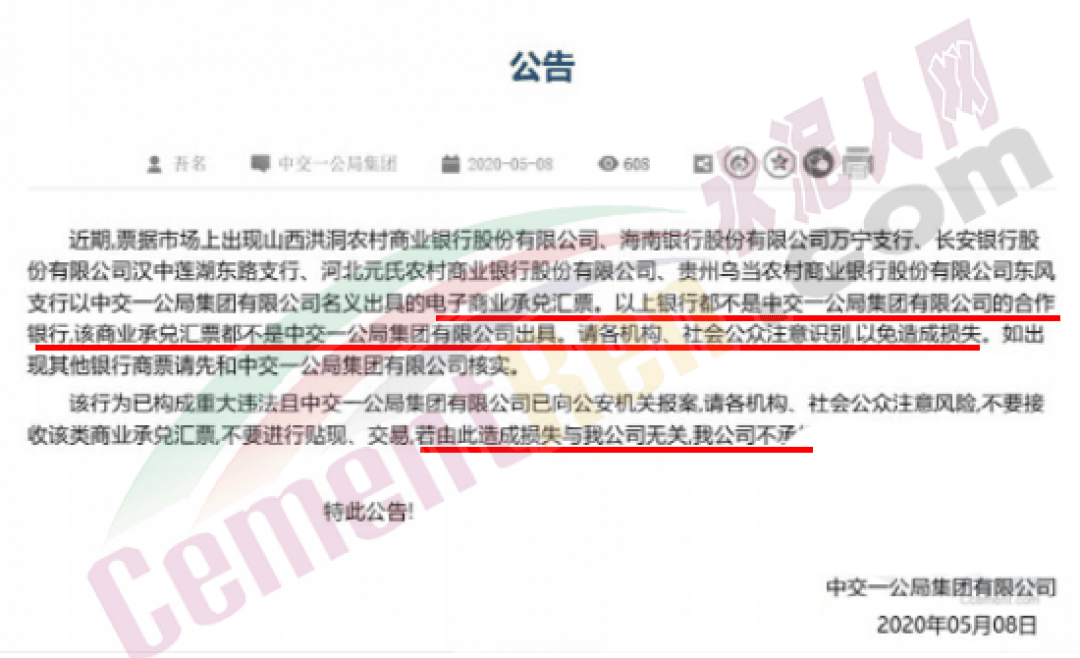 中交一航局第一工程限公司發聲明稱公司被人冒名開戶+開具虛假電子商票。公司對上述虛假銀行帳戶及虛假電子商業承兌匯票不承擔任何性質的責任。