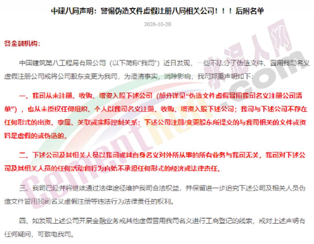 中建八局聲明,有不法分子涉嫌偽造中建八局證照及相關資料,采用虛假手段冒用中建八局名義開立銀行賬戶,并冒用八局名義虛假開具商業承兌匯票,自2018年7月1日起,中建八局或下屬分子公司已全面停止對外開具電子或紙質商業承兌匯票。
