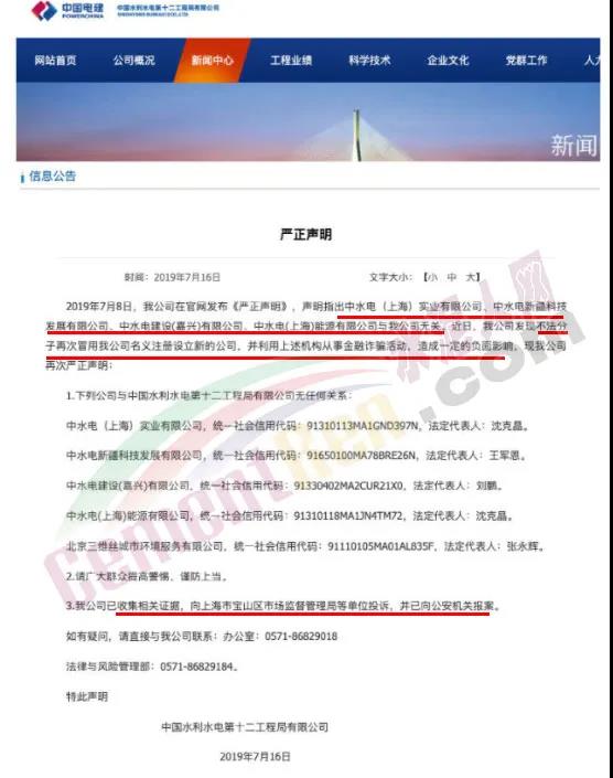 中國水利水電第十二工程局有限公司聲明,被人冒充名義注冊設立“中水電(上海)實業有限公司”等多家公司并開出票據造成負面影響。