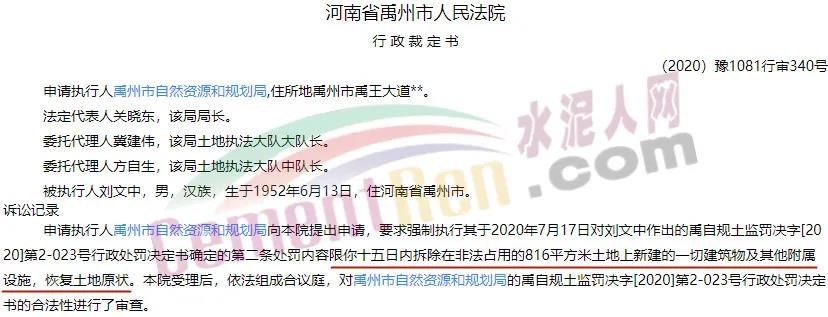 (2020)豫1081行審355號(hào)行政裁定書,準(zhǔn)予執(zhí)行禹州市自然資源和規(guī)劃局對(duì)被執(zhí)行人禹州市錦信水泥有限公司磊磊石分公司作出的禹自規(guī)土監(jiān)罰決字[2020]第2-025號(hào)行政處罰,決定書載明第一條處罰限你單位十五日內(nèi)拆除在非法占用的11556平方米土地上新建的一切建筑物及其他附屬設(shè)施,恢復(fù)土地原狀。由禹州市自然資源和規(guī)劃局組織實(shí)施。