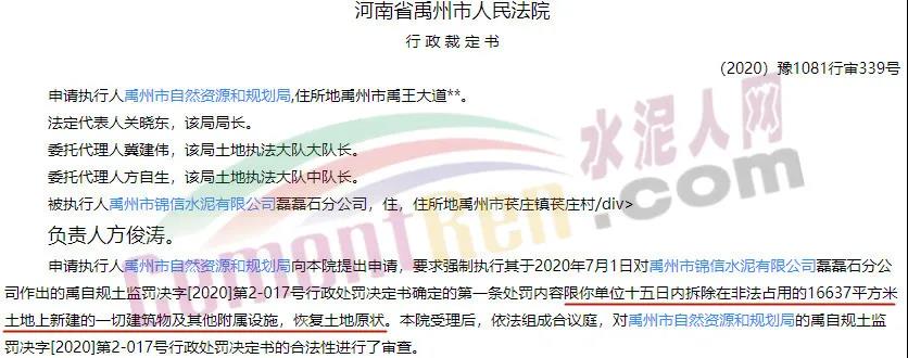 根據(jù)禹州市人民法院(2020)豫1081行審339號(hào)行政裁定書顯示,準(zhǔn)予執(zhí)行禹州市自然資源和規(guī)劃局對(duì)被申請(qǐng)執(zhí)行人禹州市錦信水泥有限公司磊磊石分公司作出的禹自規(guī)土監(jiān)罰決字[2020]第2-017號(hào)行政處罰決定書中的第一條處罰責(zé)令限你單位十五日內(nèi)拆除在非法占用的16637平方米土地上新建的一切建筑物及其他附屬設(shè)施,恢復(fù)土地原狀。違法行為由禹州市自然資源和規(guī)劃局組織實(shí)施。