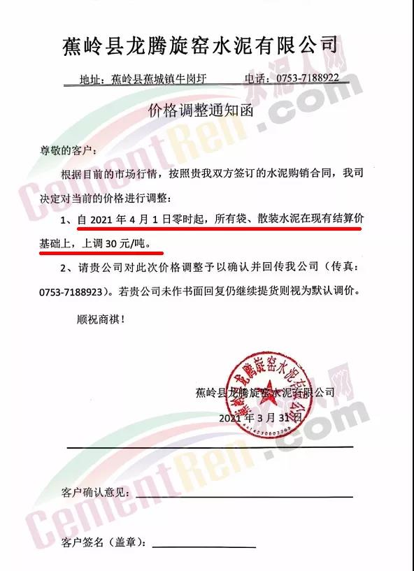 蕉嶺縣龍騰旋窯水泥有限公司通知自4月1日起,所有袋、散裝水泥在現(xiàn)有結(jié)算價基礎(chǔ)上,上調(diào)30元/噸。