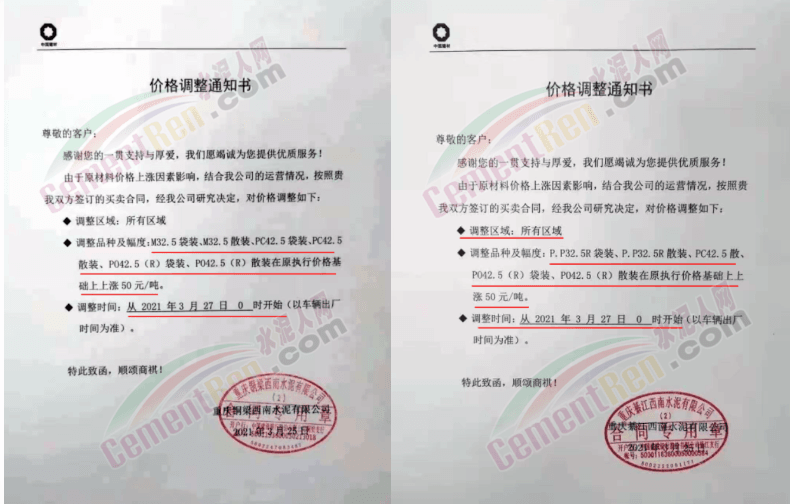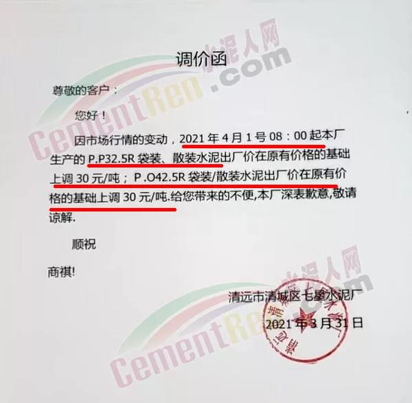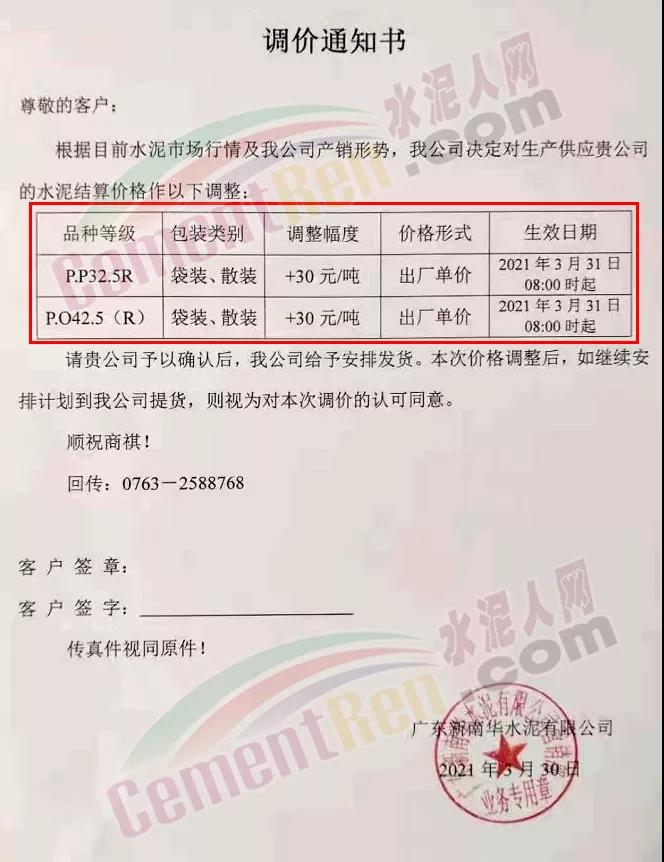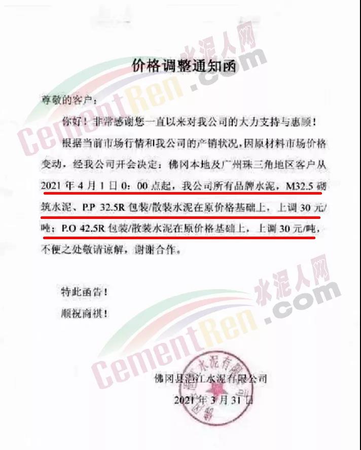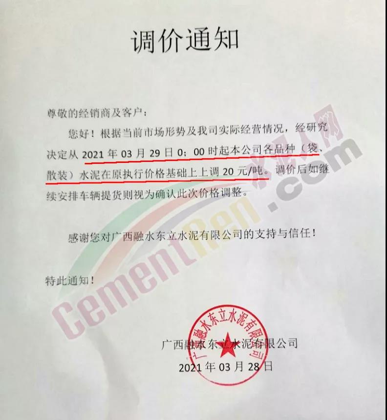 由于原燃材料大幅度上漲,經(jīng)我司研究決定,從2021年04月1日起,我司發(fā)往廣東省的各品牌、各品種規(guī)格袋裝、散裝水泥出廠單價在原價格基礎(chǔ)上每噸上調(diào)30元。熟料出廠單價在原價格基礎(chǔ)上每噸上調(diào)20元。不便之處,敬請見諒。