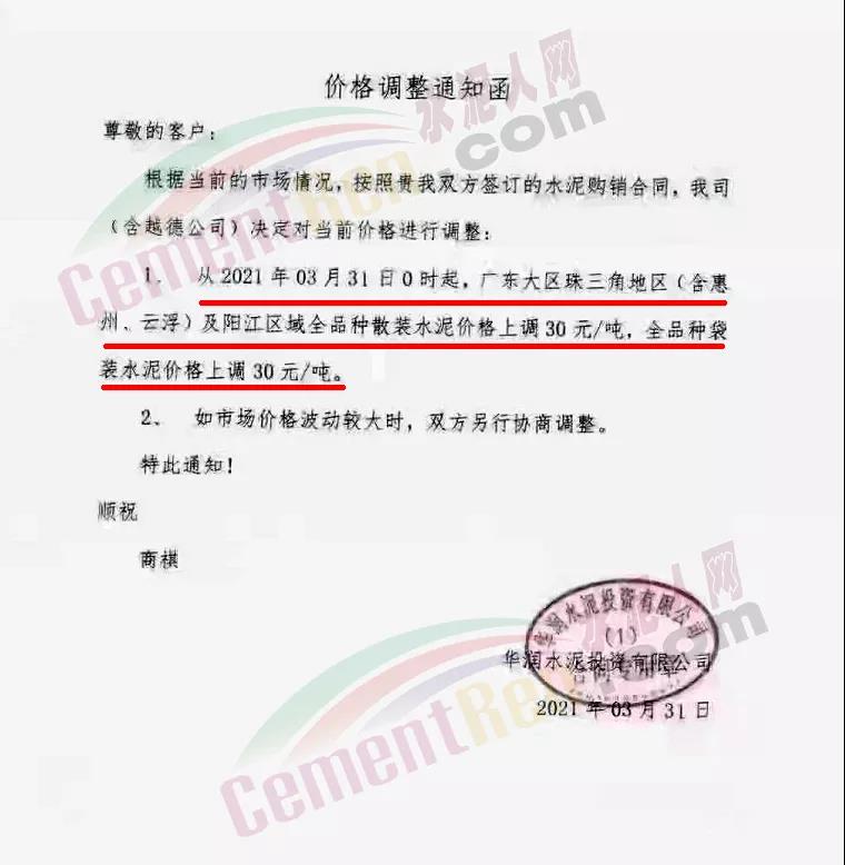 華潤水泥投資有限公司通知,自3月31日0時起,廣東珠三角地區(qū)(含惠州、云浮)及陽江全區(qū)域全品種袋裝和散裝水泥價格上調(diào)30元/噸。