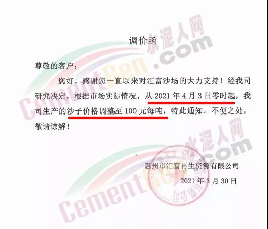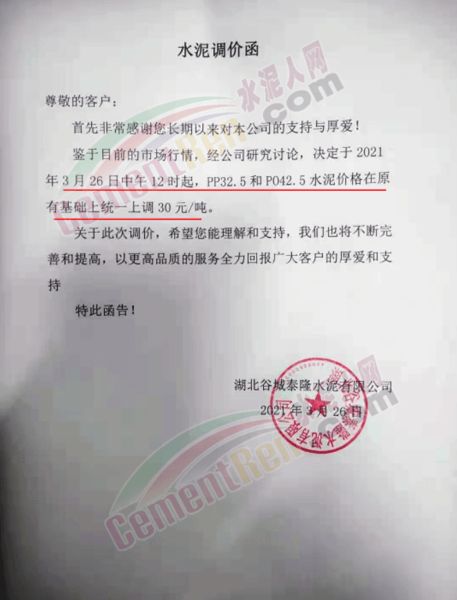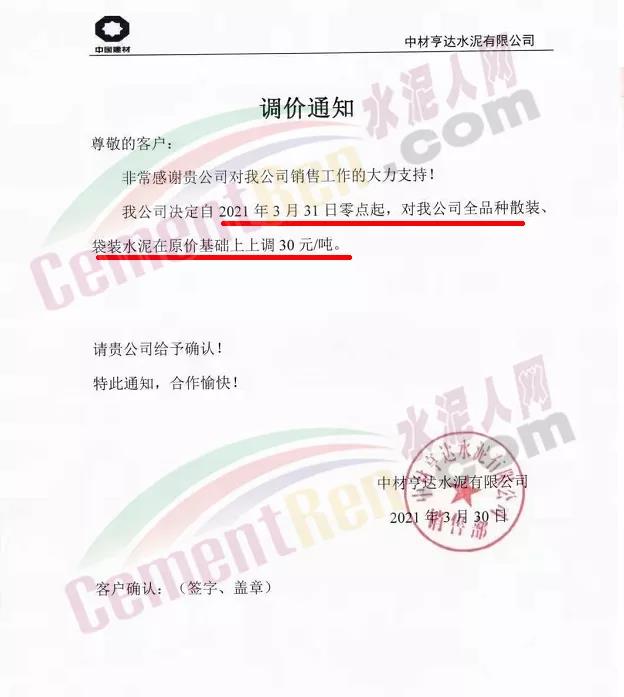 感謝您長期以來對我公司產(chǎn)品的信任和支持。因生產(chǎn)成本增加,庫存緊張,經(jīng)我公司研究決定:為了確保持續(xù)向客戶保質(zhì)保量提供優(yōu)質(zhì)產(chǎn)品,自2021年3月31日早8點(diǎn)開始對我公司產(chǎn)品價格做出如下調(diào)整:P.O42.5等級水泥產(chǎn)品在原價基礎(chǔ)上上調(diào)30元/噸。我公司將以微信或短信形式發(fā)送調(diào)價通知,如貴公司繼續(xù)提貨則視為同意接受新價格。