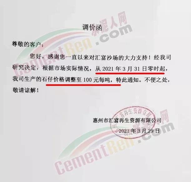 惠州市光大水泥企業(yè)有限公司通知從2021年3月31日零時起: